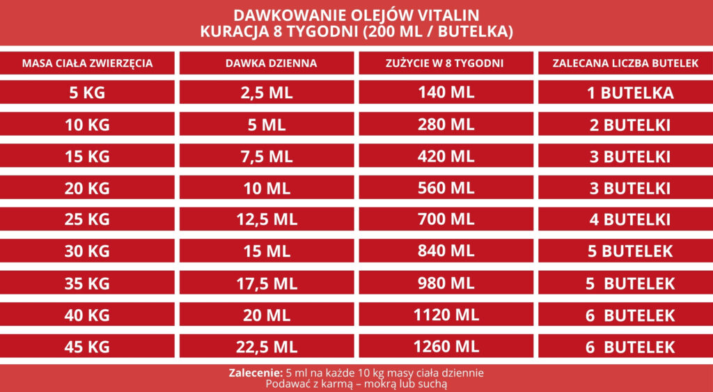 Zalecane dawkowanie znajduje się na etykiecie produktu. Produkt najlepiej wykorzystać przed terminem przydatności podanym na opakowaniu. Preparat poleca się jako dodatek do karmy w dawce dziennej 2 łyżeczki od herbaty na 10 kg wagi ciała. Podawanie preparatu powinno być kontynuowane przez 6 – 8 tygodni.